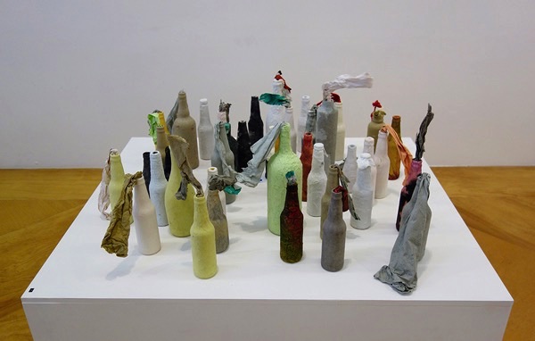 Materials: Handmade paper by the Artist on glass bottles